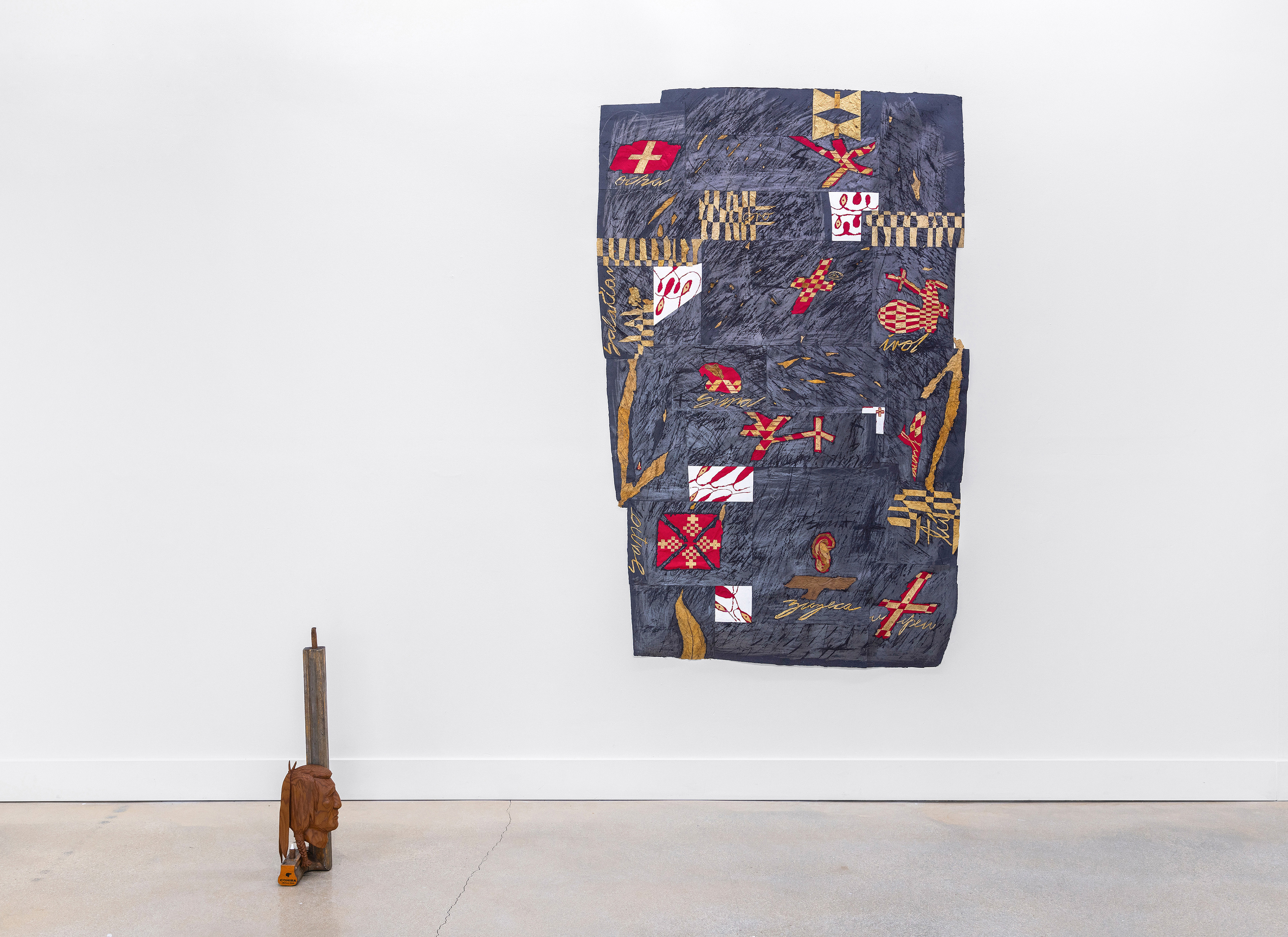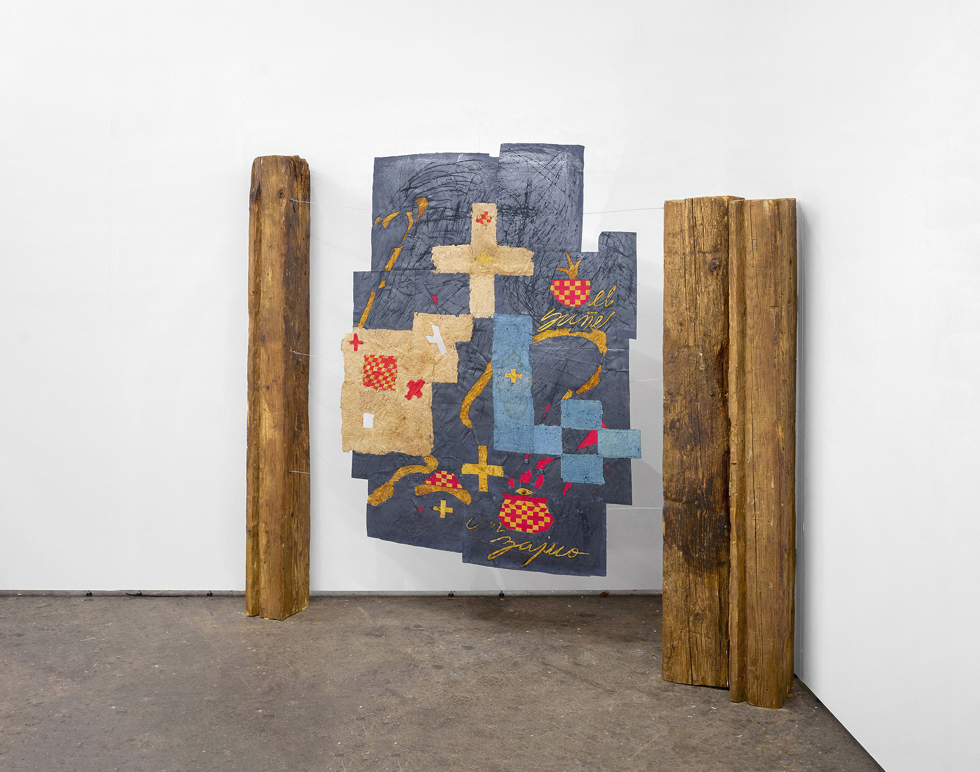 Virginia Flue Cured tobacco on handmade paper dyed with indigo, graphite; Iris pulp; Repurposed wooden beams.