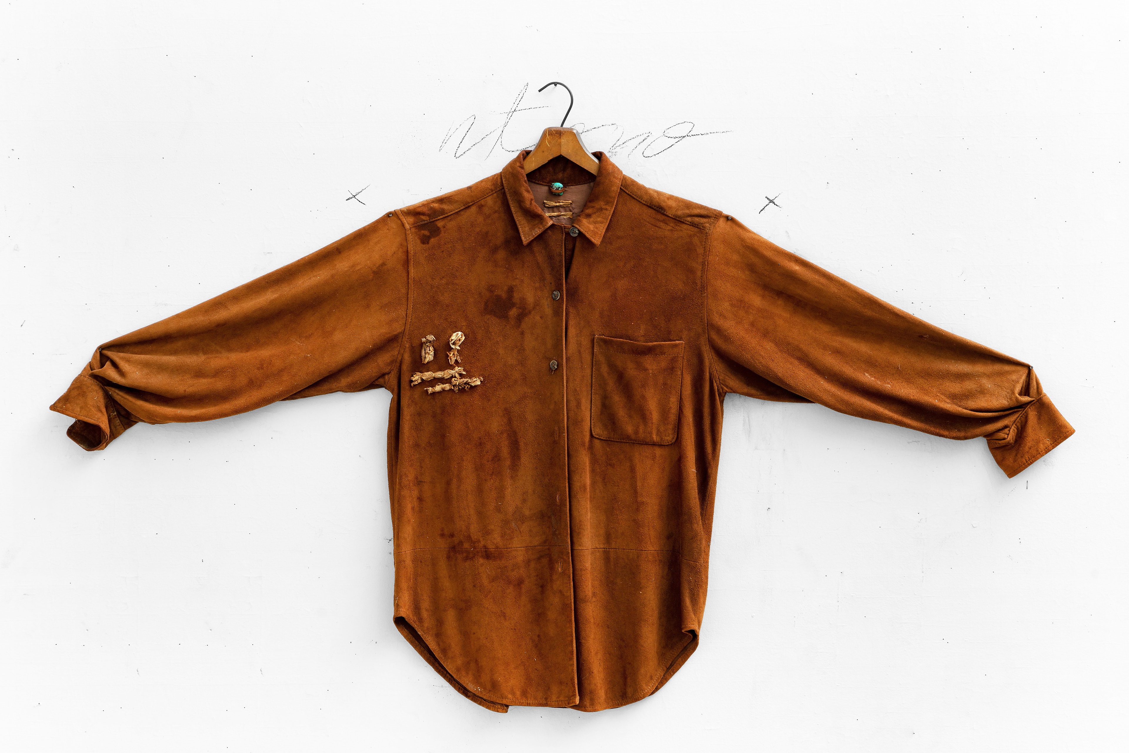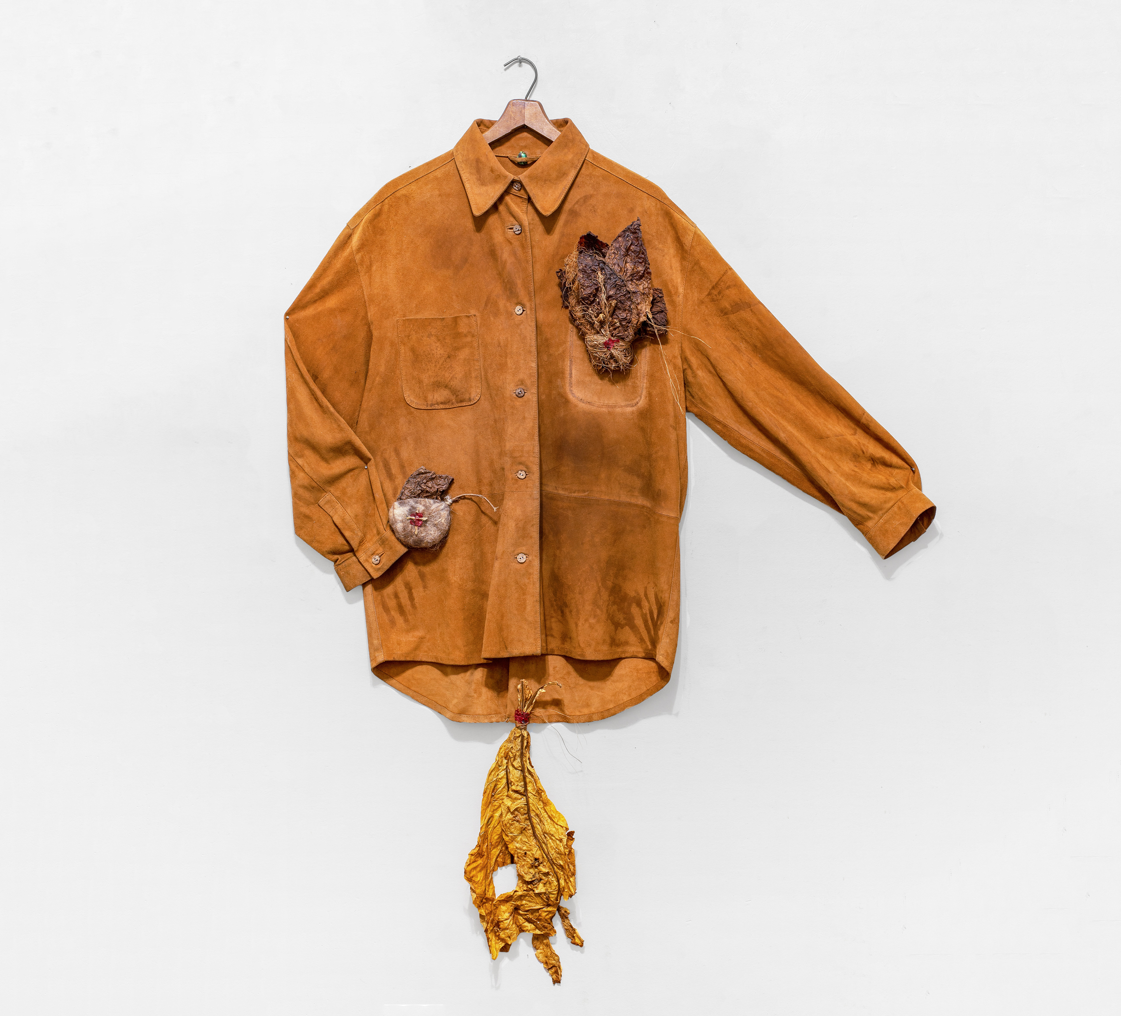 Connecticut broadleaf tobacco, turquoise, unwashed wool, and abacá on a suede shirt.