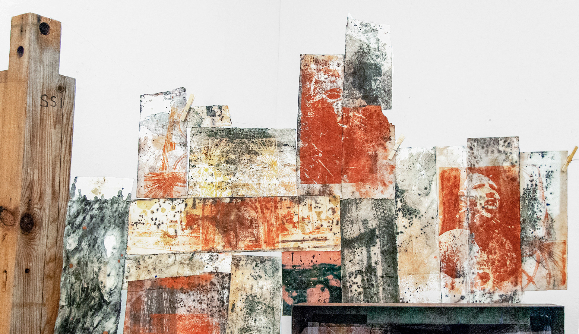 Virginia Flue Cured tobacco on handmade paper dyed with cochineal, madder, and logwood, pulp silkscreen; Cast handmade paper on cascarilla powder.