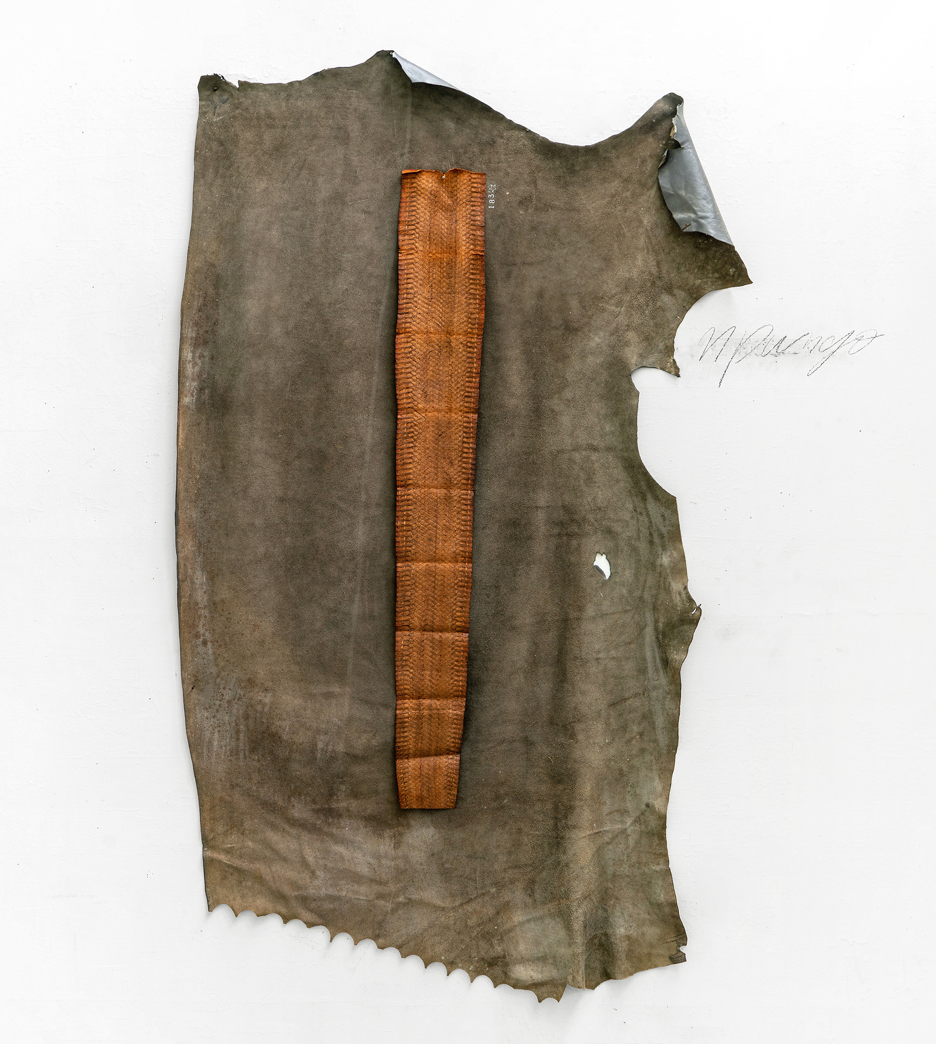 Cuban tobacco, Virginia Flue Cured tobacco, snake skin, and turquoise on handmade paper dyed with graphite, pulp painting.