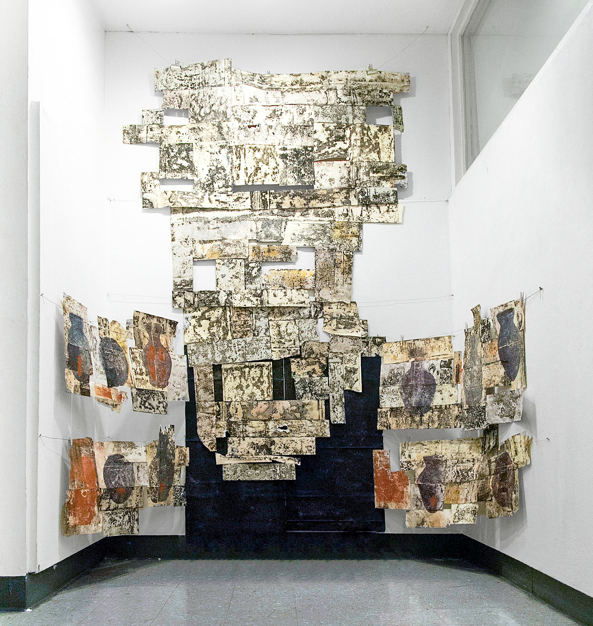 Raw pigment, steel, etching ink, collagraph on stained paper with coffee, wine, and tea.